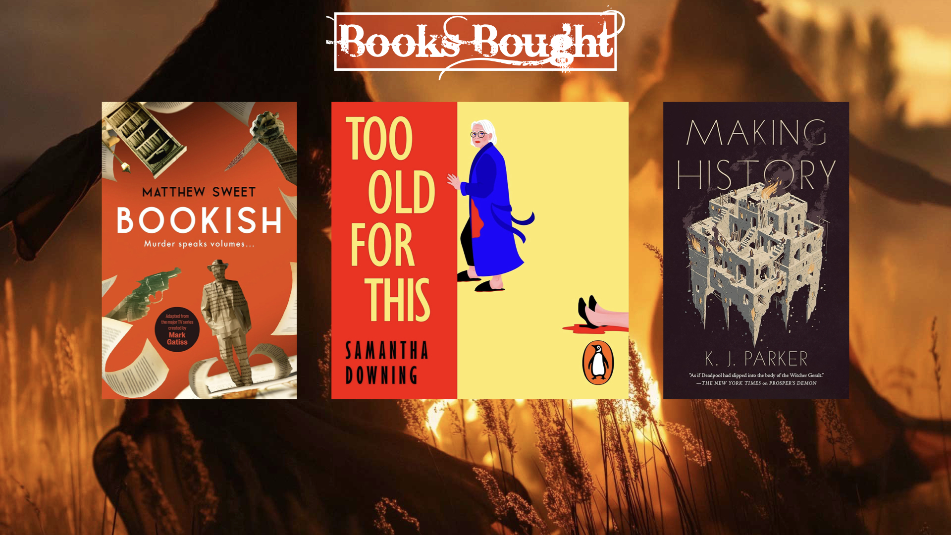 The three books I bought this week are unted only by their quirky nature and by the fact that all of the authors are new to me.. One is a cosy mystery novelisaton of a recent British TV series set in London in 1946, One is about a killer who now sees herself as too old to be bothered killing anyone… unless they leave her no choice. One is a fantasy mystery that provides a vehicle for considering how history is made and by whom.