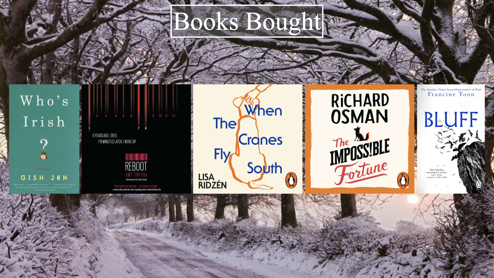 I bought widely this week: a book of short stories about the experience of second-generation immigrants to the US; a Young Adult Science Fiction novel about revenant warriors; a Swedish novel about an old man facing death; the fifth Thursday Murder Club book; and a contemporary mystery set in small, ancient Scottish coastal town.