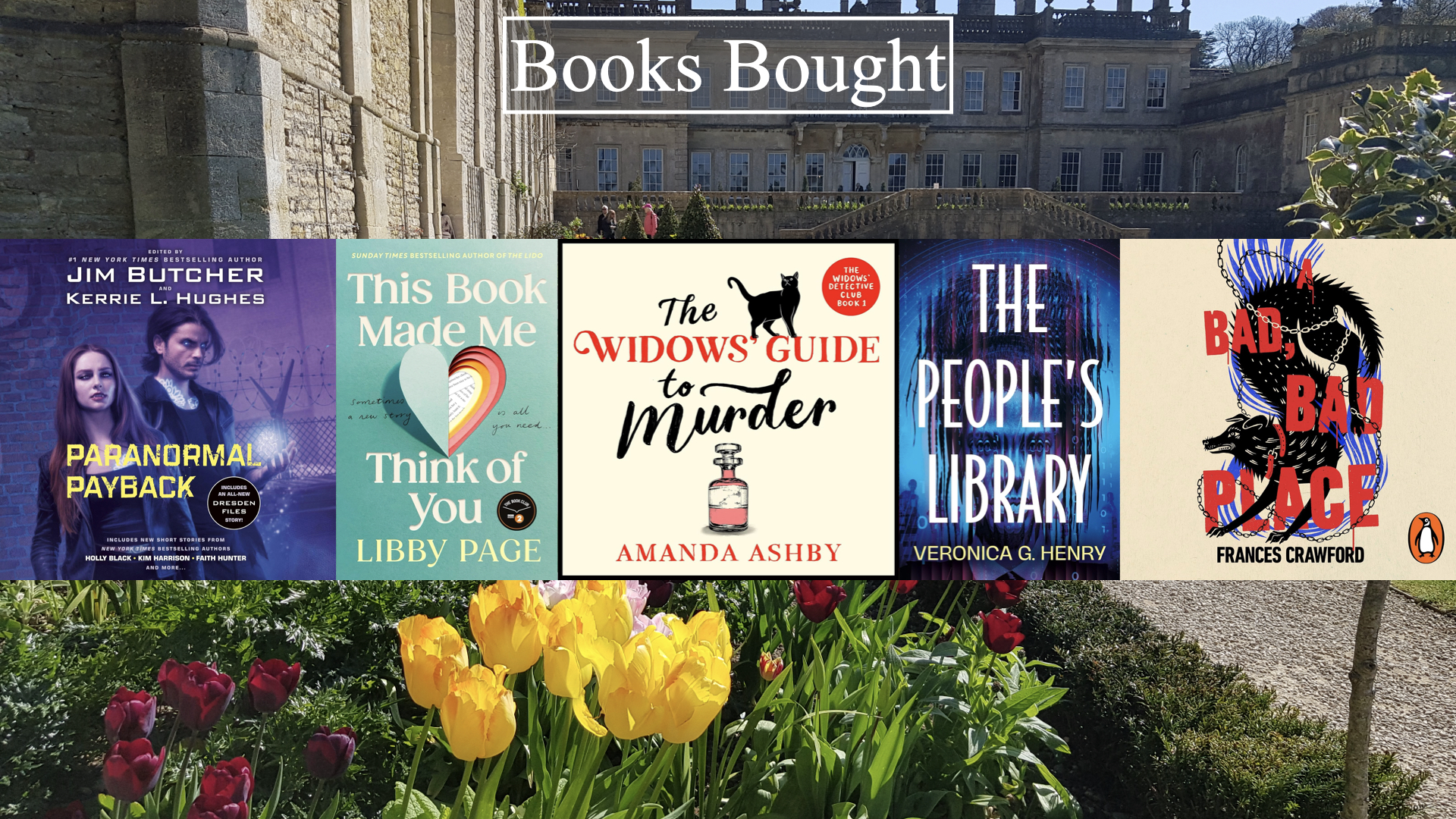 I bought five books this week: a collection ofparanormal short stories, a cosy mystery, an historical crime novel, a bookish book about grieving, and a Science Fiction thriller.